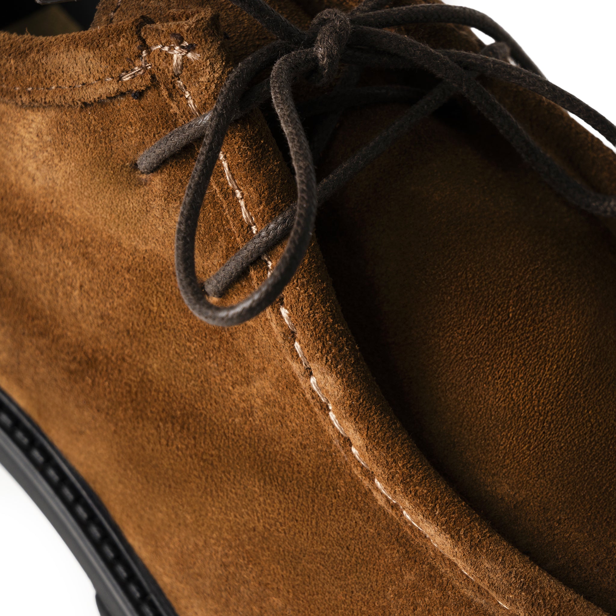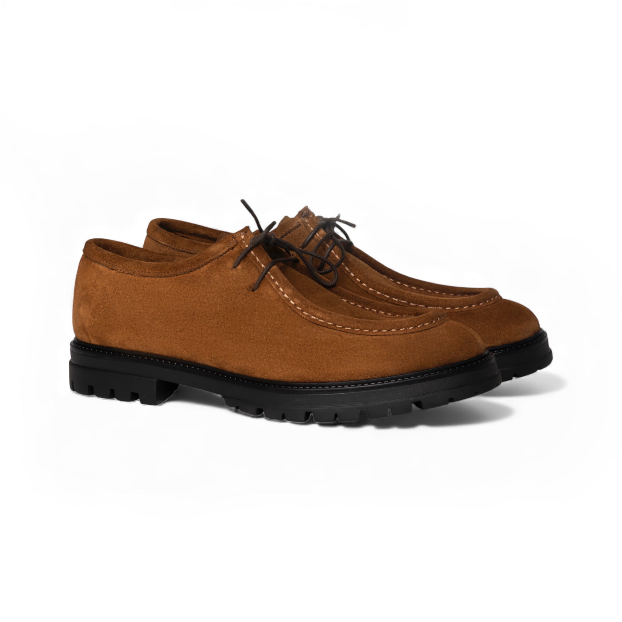 Decimo è realizzato in morbido camoscio color cuoio, con una silhouette essenziale ma di carattere. Le cuciture a vista valorizzano la forma della tomaia, mentre la suola roccia in gomma garantisce stabilità, aderenza e un look deciso perfetto per l’uso quotidiano.