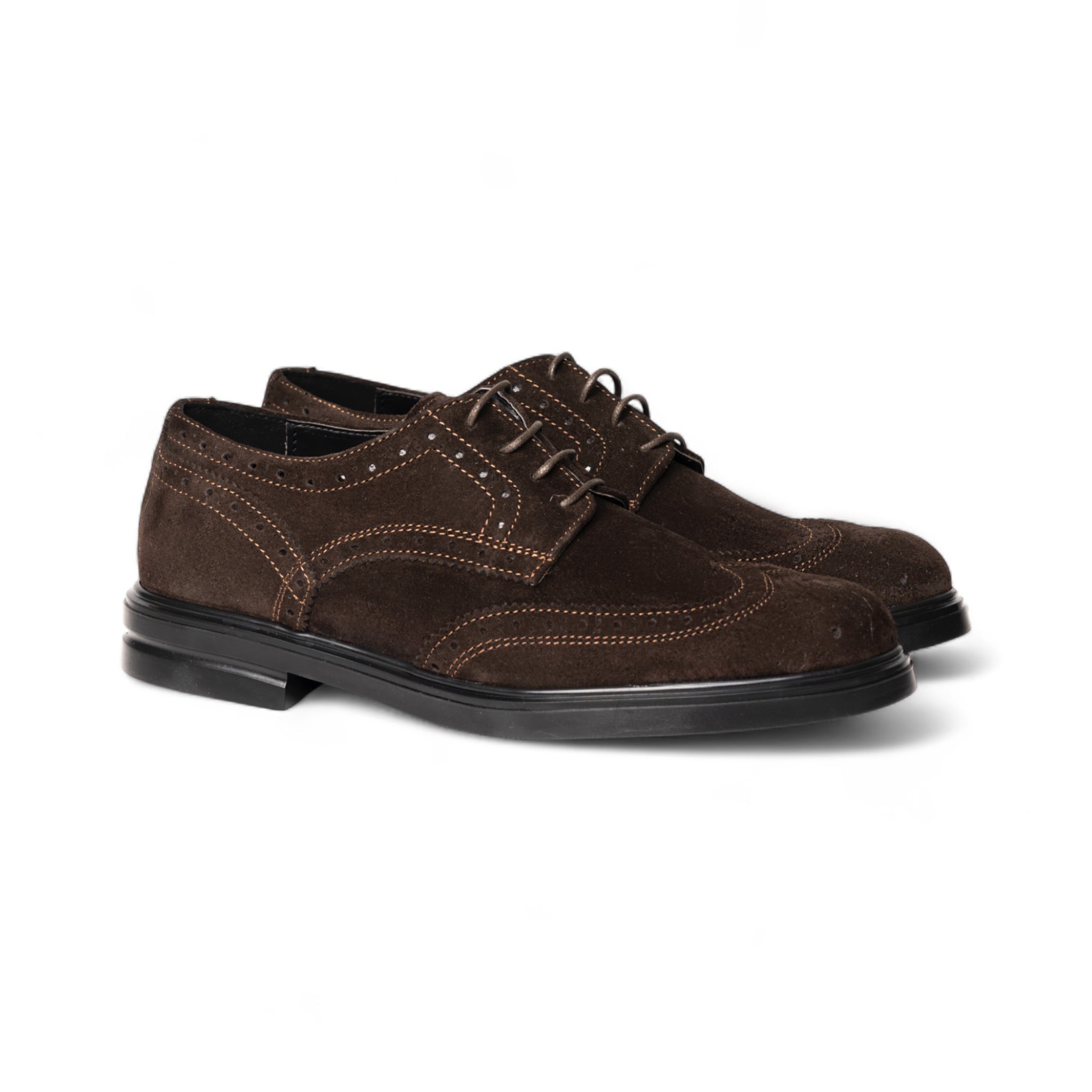 Derby Emiliano in camoscio testa di moro, caratterizzata da cuciture brogue decorative che donano un tocco classico e ricercato. La tomaia in morbido camoscio offre comfort e raffinatezza, mentre la suola in gomma garantisce leggerezza, flessibilità e un’ottima aderenza. Una calzatura versatile, ideale per un look elegante ma disinvolto.
