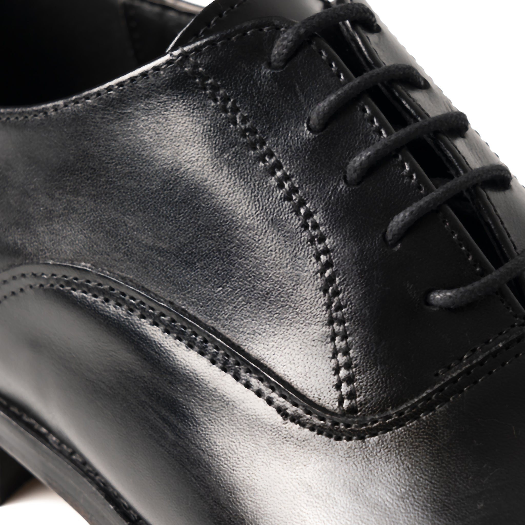 Derby realizzata in vitello nero con suola in cuoio e mezza piantina in gomma, espressione di eleganza classica e comfort contemporaneo. La pelle liscia e luminosa valorizza la linea sobria del modello, mentre la suola in cuoio con inserto in gomma garantisce stabilità e durata. Un design intramontabile, perfetto per completare con stile sia look formali che casual raffinati.