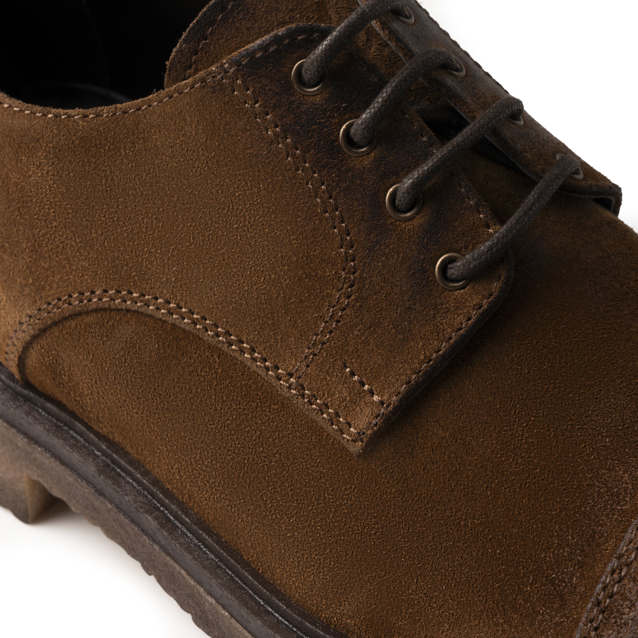 Derby Valerio in morbido suede color cuoio, caratterizzato da punta leggermente brunita e cuciture tono su tono che ne esaltano la linea artigianale. La suola in crep ambra garantisce comfort e flessibilità, aggiungendo un tocco di eleganza casual ideale per ogni occasione.