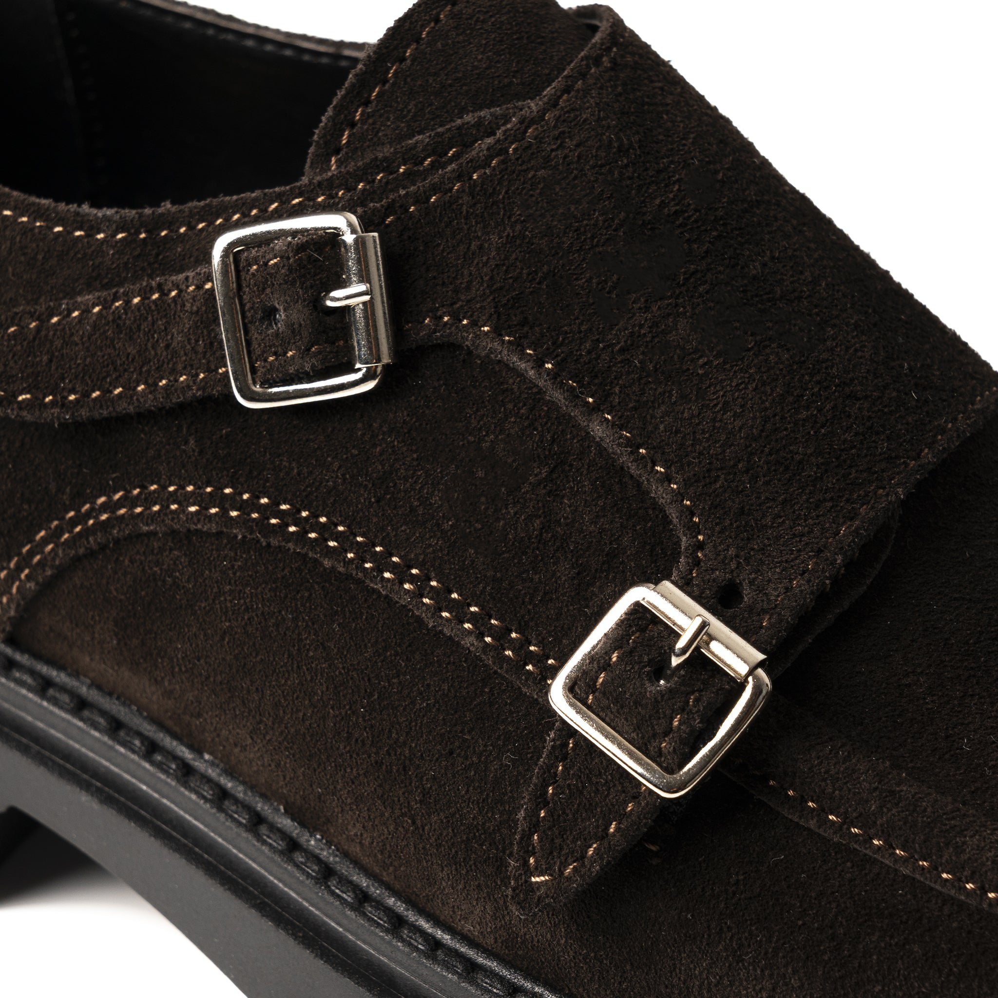 Monk realizzato in morbido camoscio color testa di moro con doppia fibbia laterale. La suola light garantisce leggerezza e comfort, mantenendo un look contemporaneo e raffinato. Linee pulite e design essenziale per uno stile versatile, perfetto per completare outfit casual o più ricercati.