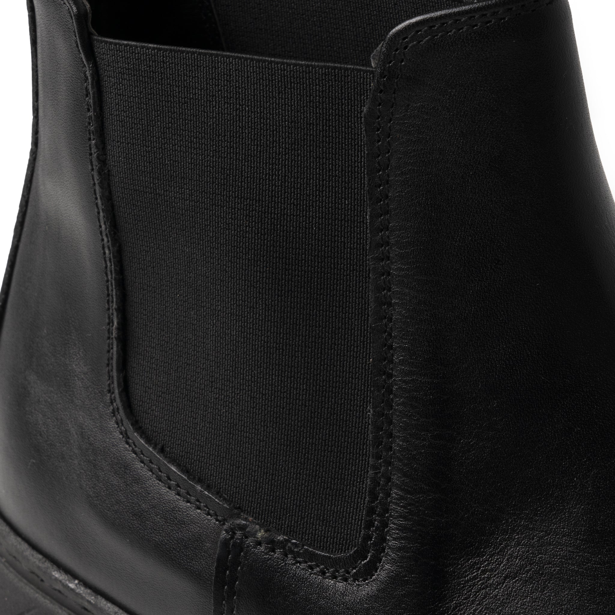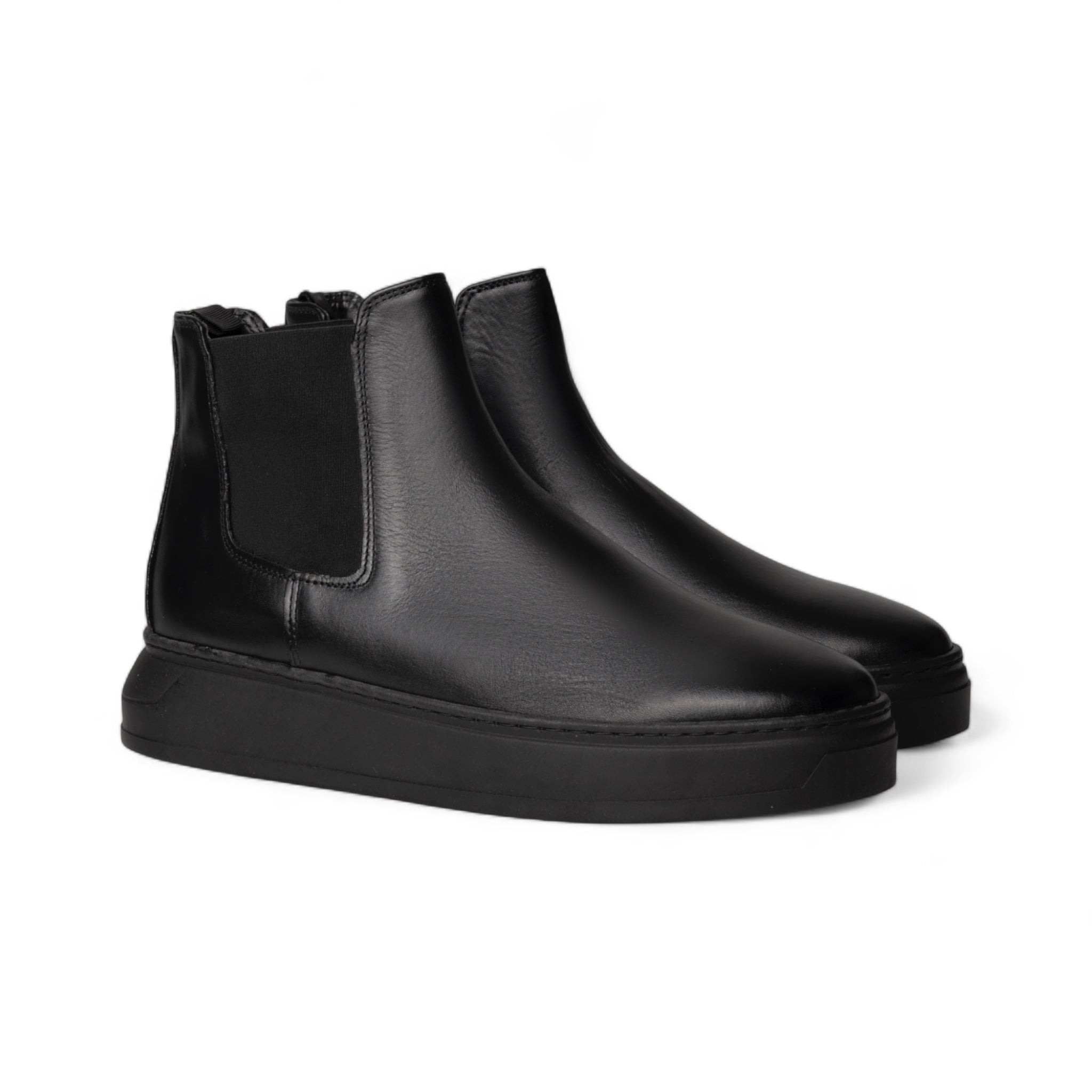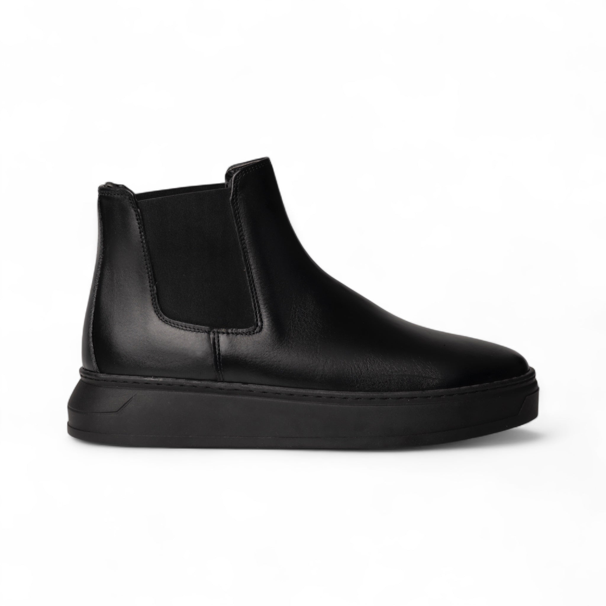 Stivaletto in vitello nero dal design essenziale e contemporaneo, caratterizzato da inserti elastici laterali per una calzata pratica e confortevole. La suola in gomma ar nera offre leggerezza e aderenza, completando un modello versatile perfetto per un look urbano e moderno.